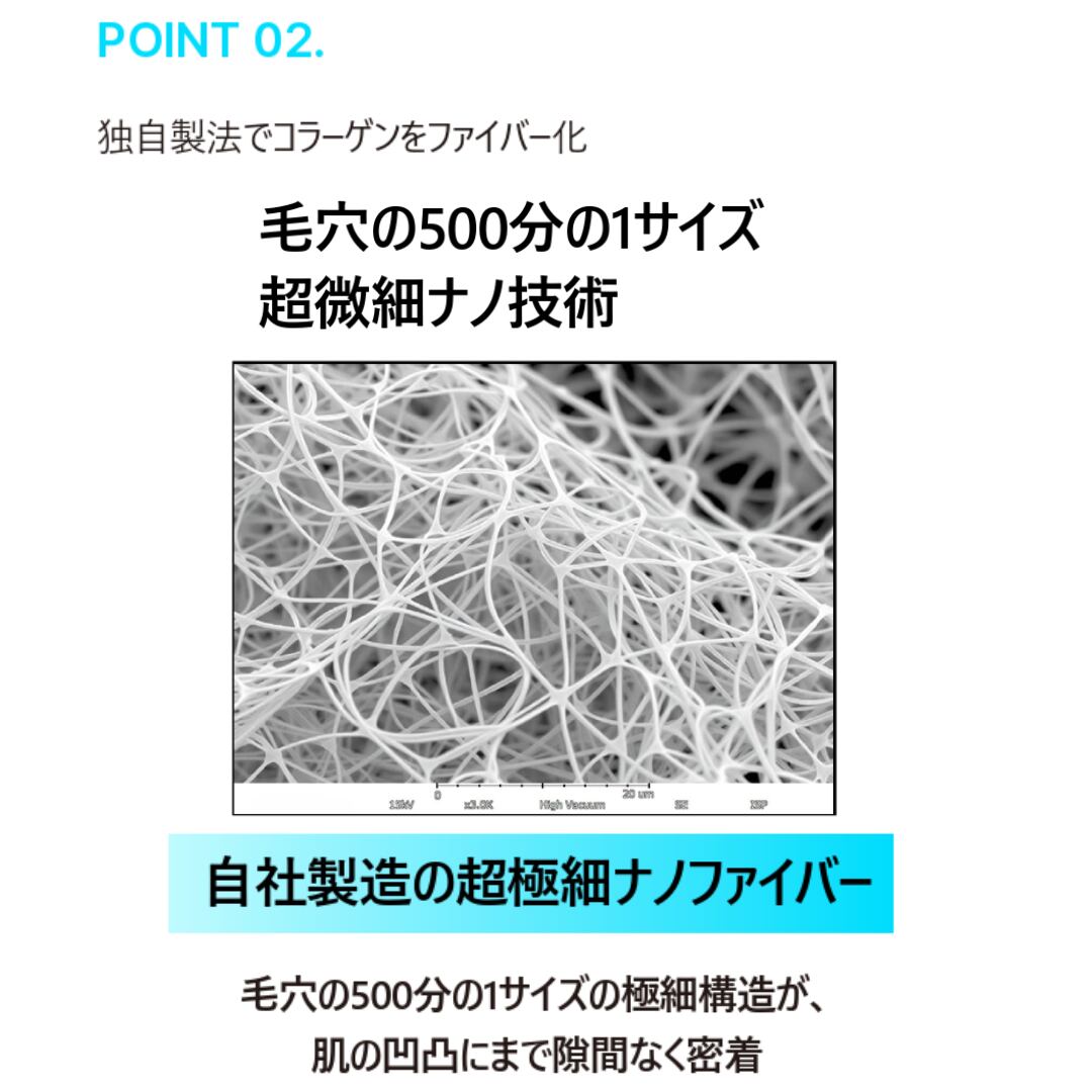 ナノコラーゲンシートは、清浄な北大西洋の食用品グレードのコラーゲンをナノ単位でファイバー化し、100%コラーゲンのみで作られています。このため、肌実感が抜群の効果を発揮します!