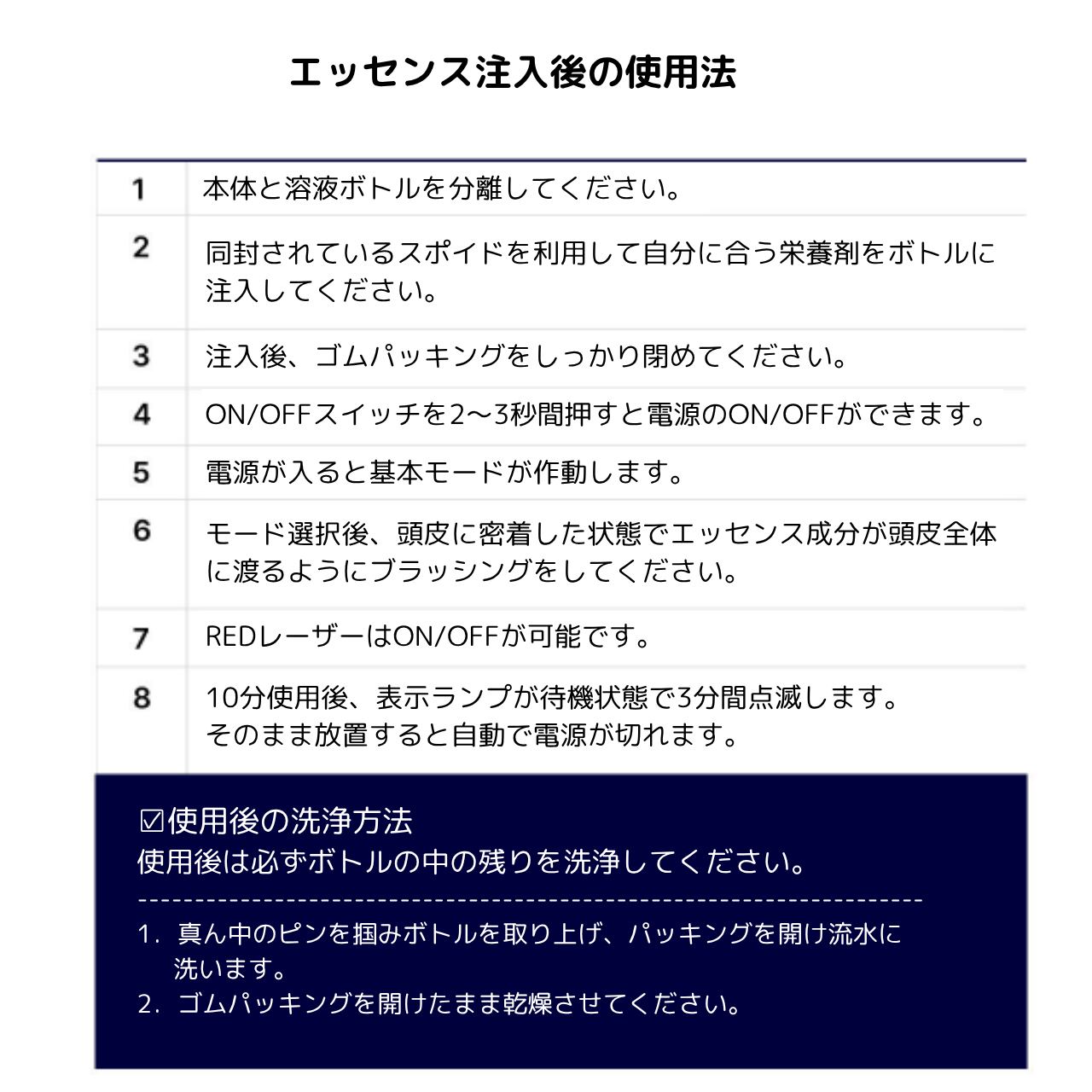 ① 1段階(低刺激RFケア): RFと低出力赤色光レーザーによる頭皮刺激で、毛根強化と頭皮の弾力に効果的